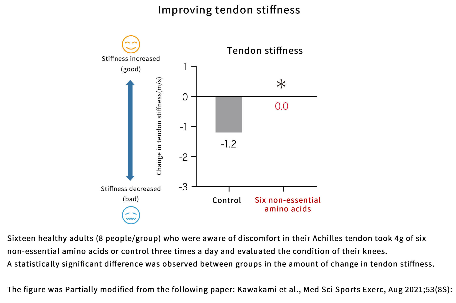 Furthermore, the group that consumed foods containing amino acids also saw an improvement in the decline in tendon elasticity (Figure 7). As some research has shown that tendon elasticity is related to jumping power, it is thought that consuming the "6 Amino Acid Mix for Joint and Tendon Conditioning" may be useful in improving athletic performance.