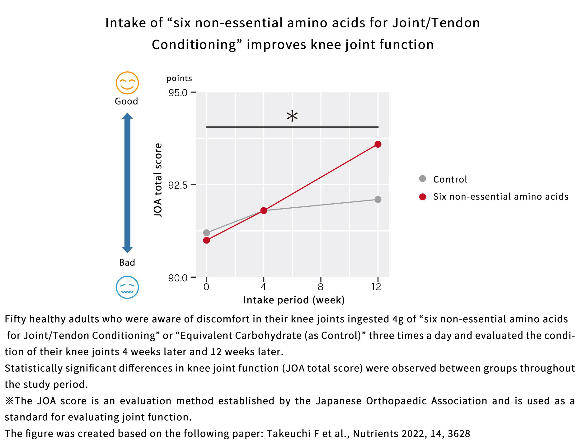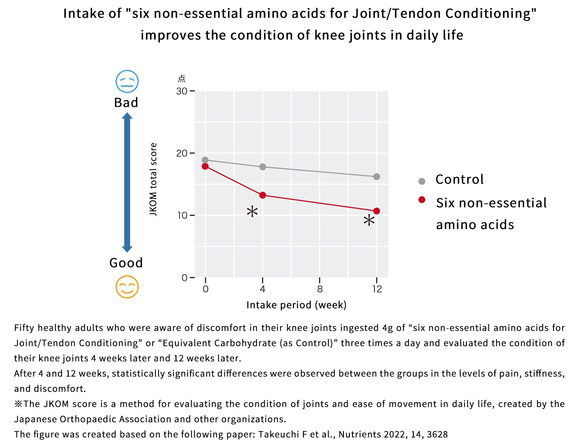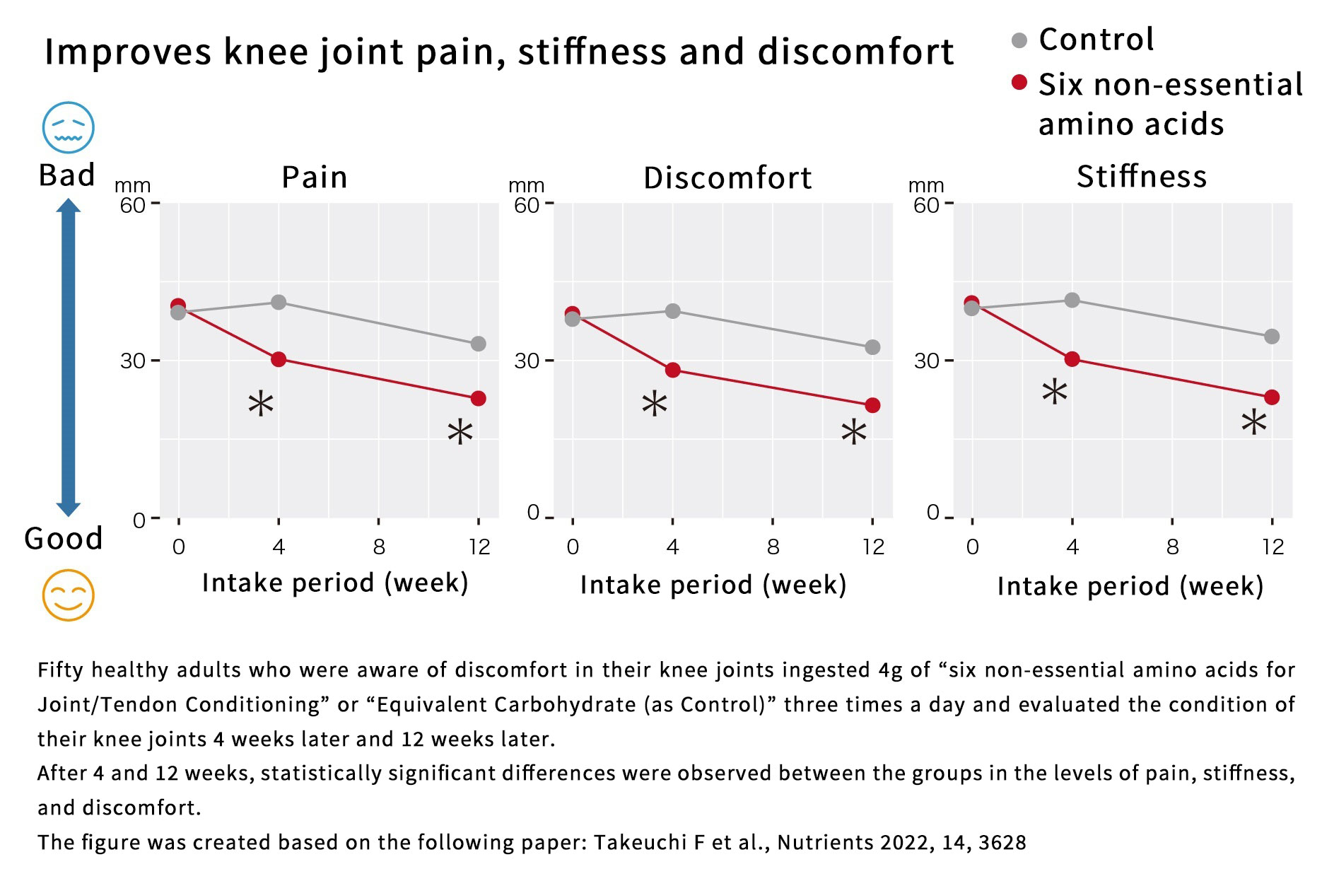 First, 25 healthy adults who regularly suffered from knee joint discomfort took the "6 Amino Acid Mix for Joint and Tendon Conditioning" three times a day. Compared to a group that consumed foods that did not contain amino acids (control), 1 and 3 weeks after starting the intake, the participants reported improvements in knee pain, discomfort, and stiffness (Figure 4), and improvements in the condition of their knee joints and their daily movements (Figure 12).