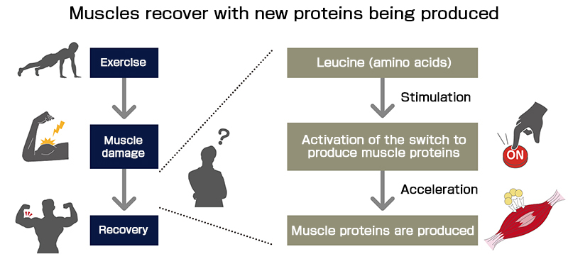 It is known that amino acids are not simply used as building blocks for muscle protein. It is also known that there is a switch that triggers the production of new muscle protein.6)In particular, it is known that the amino acid that plays the role of turning on this switch is leucine, an essential amino acid.